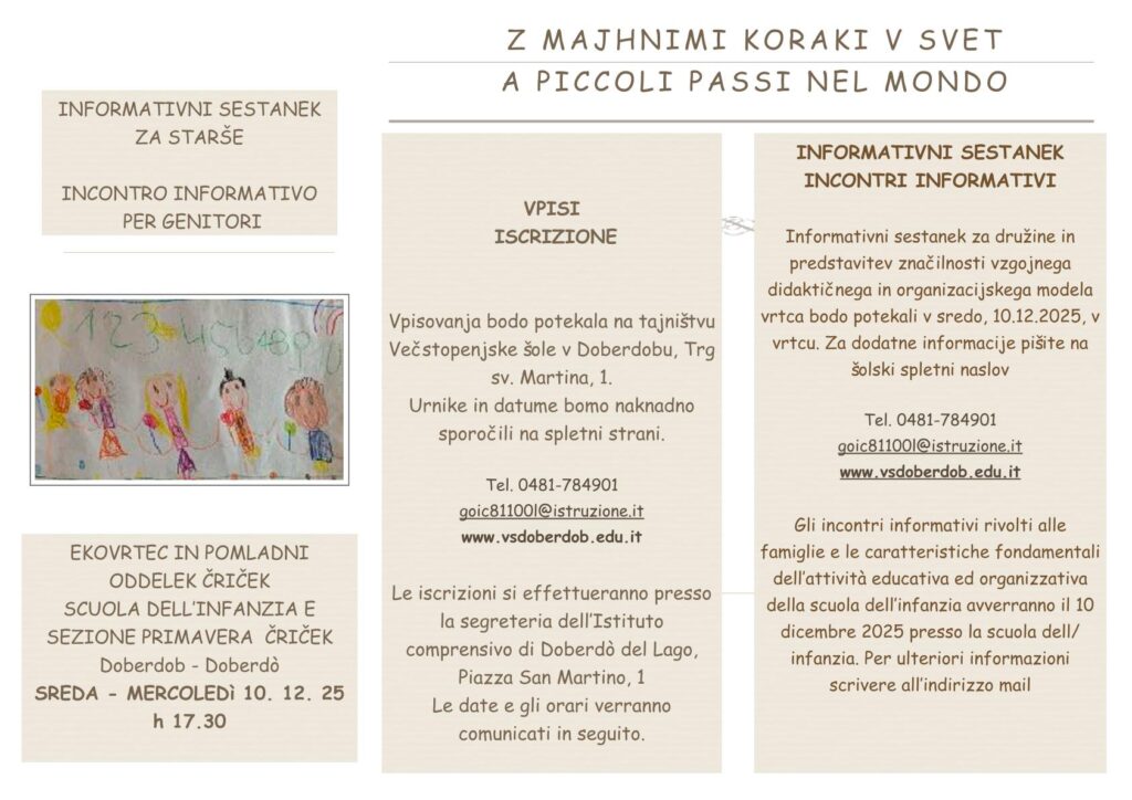 Vpisi bodo potekali na tajništvu večstopenjske šole v Doberdobu (Trg sv. Martina 1). Datum in urnik bodo objavljeni na spletni strani: www.vsdoberdob.edu.it